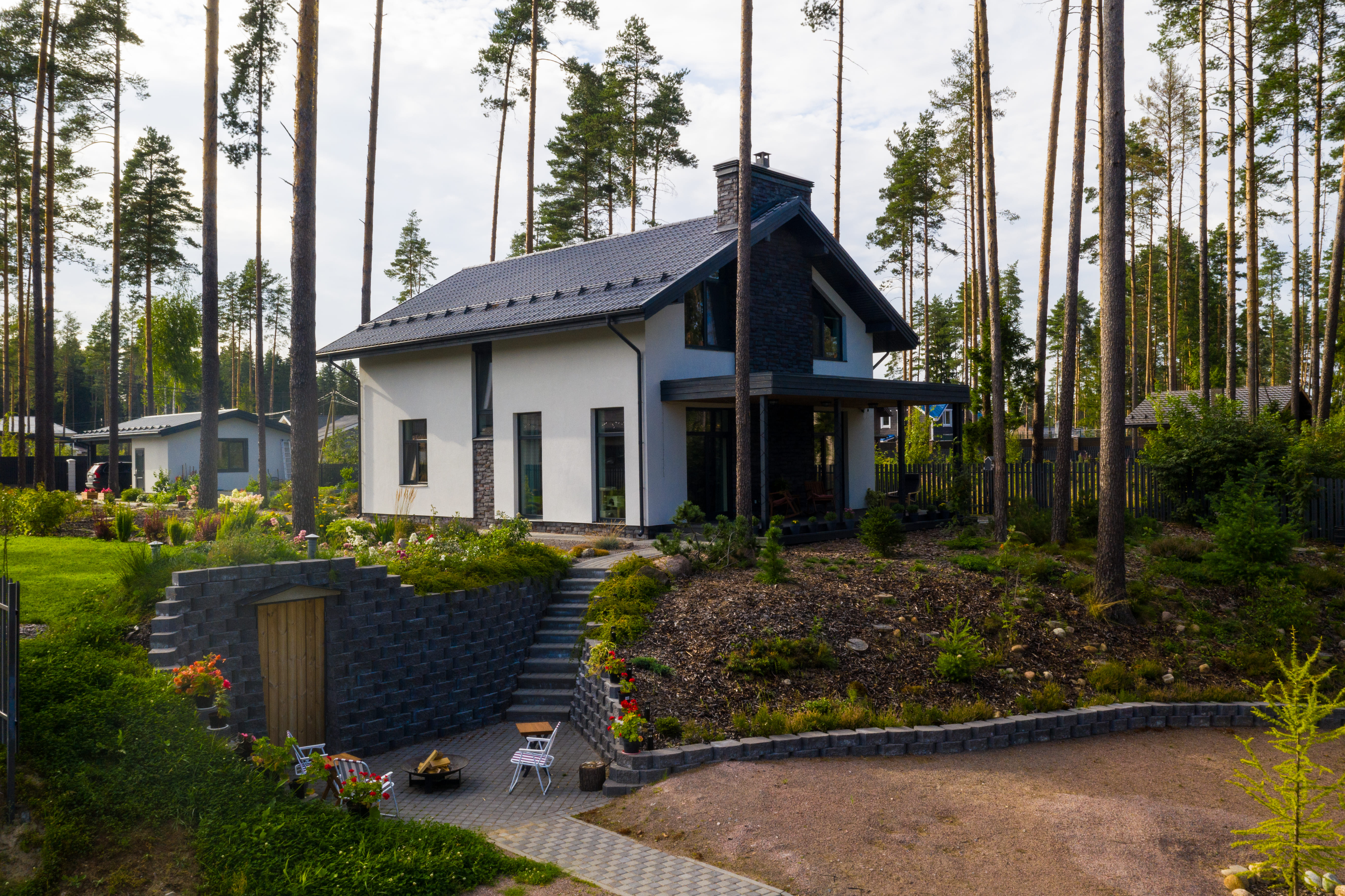Панорамными окна будут наполнять просторный дом светом. В нем удачно разместились общие зоны для отдыха и работы приватные, хозяйственно-бытовые помещения, а также имеется просторная угловая терасса для отдыха на свежем воздухе.