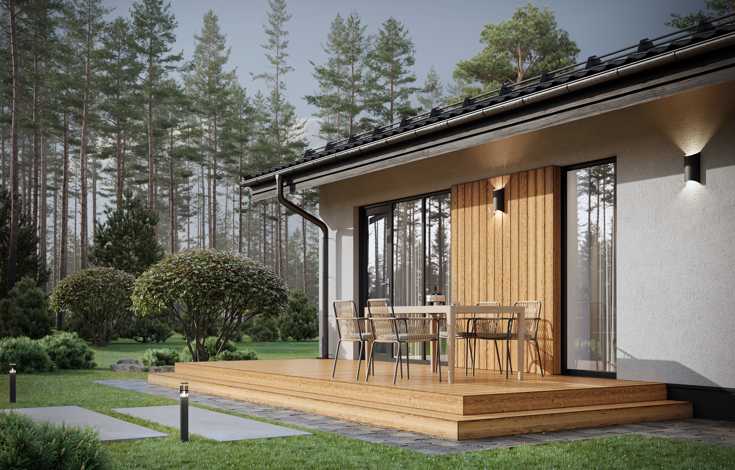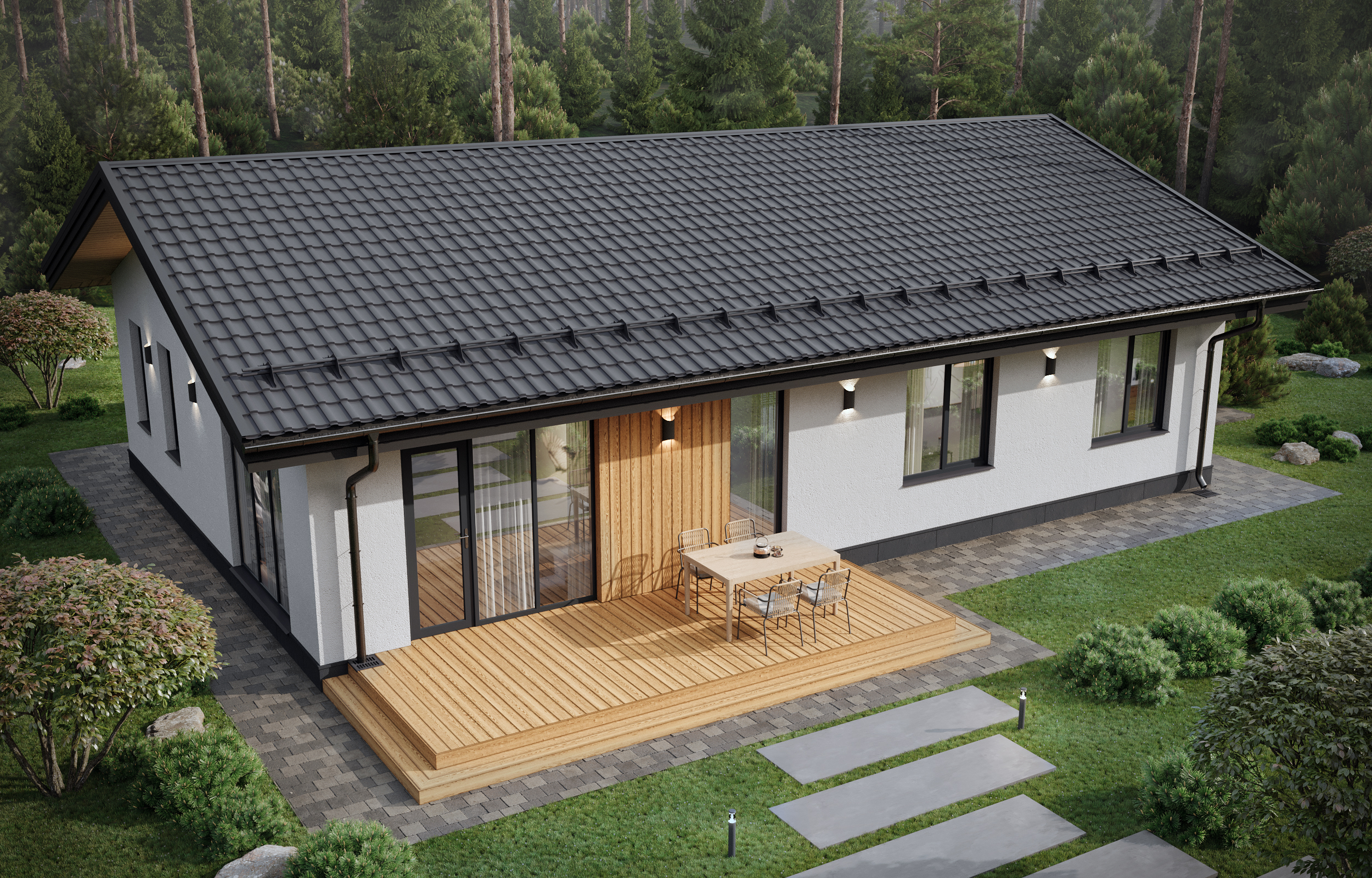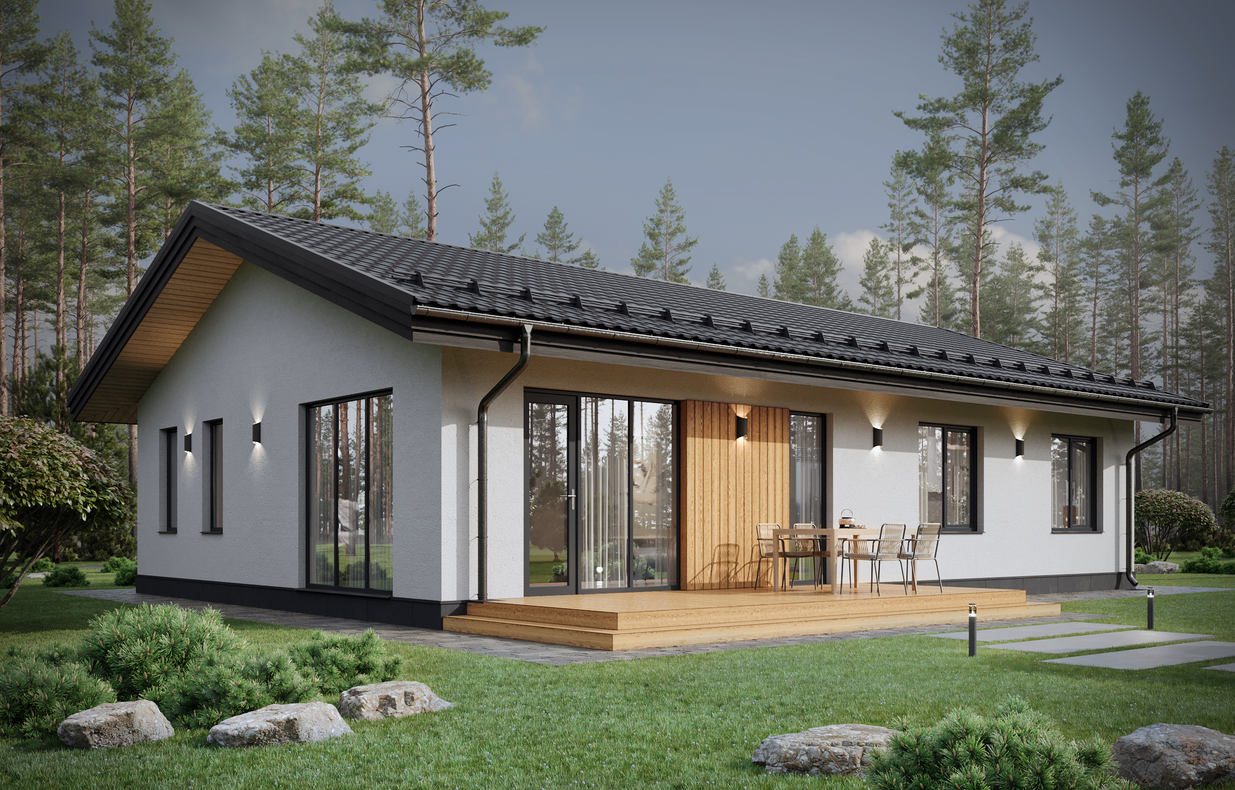 Панорамными окна будут наполнять просторный дом светом. В нем удачно разместились общие зоны для отдыха и работы приватные, хозяйственно-бытовые помещения, а также имеется просторная угловая терасса для отдыха на свежем воздухе.